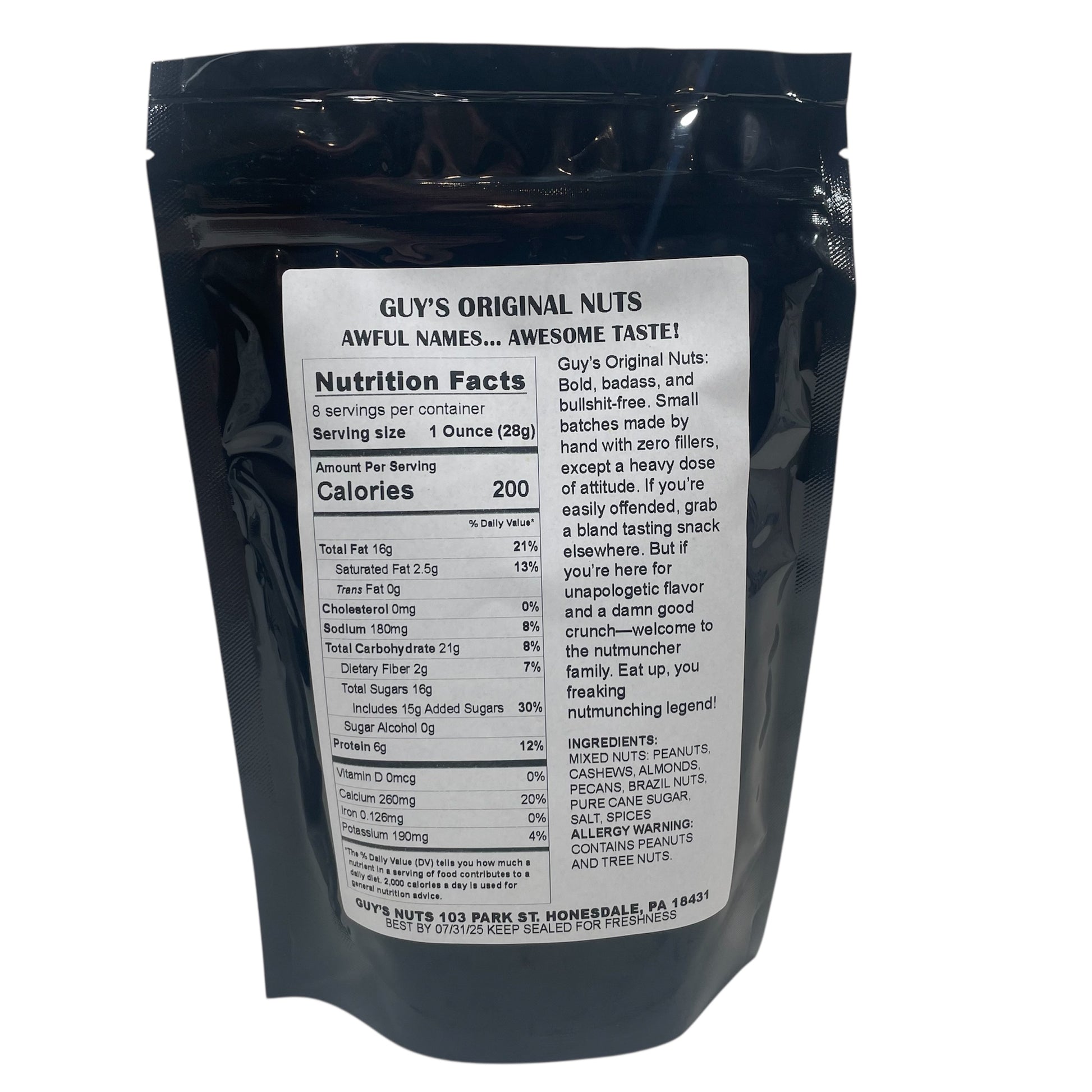 These are Guy’s Original Nuts™. These aren’t your corporate, mass-produced, focus-group-approved, flavorless excuses for a snack. Nope. Every batch of Guy’s Nuts is handmade in small batches, handled with care, and made for people who appreciate quality, hard work, and a little unapologetic fun.
